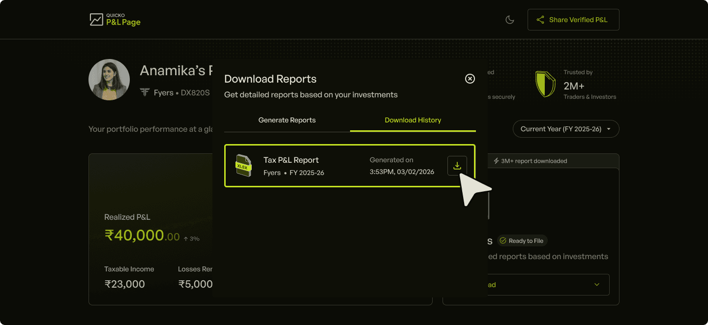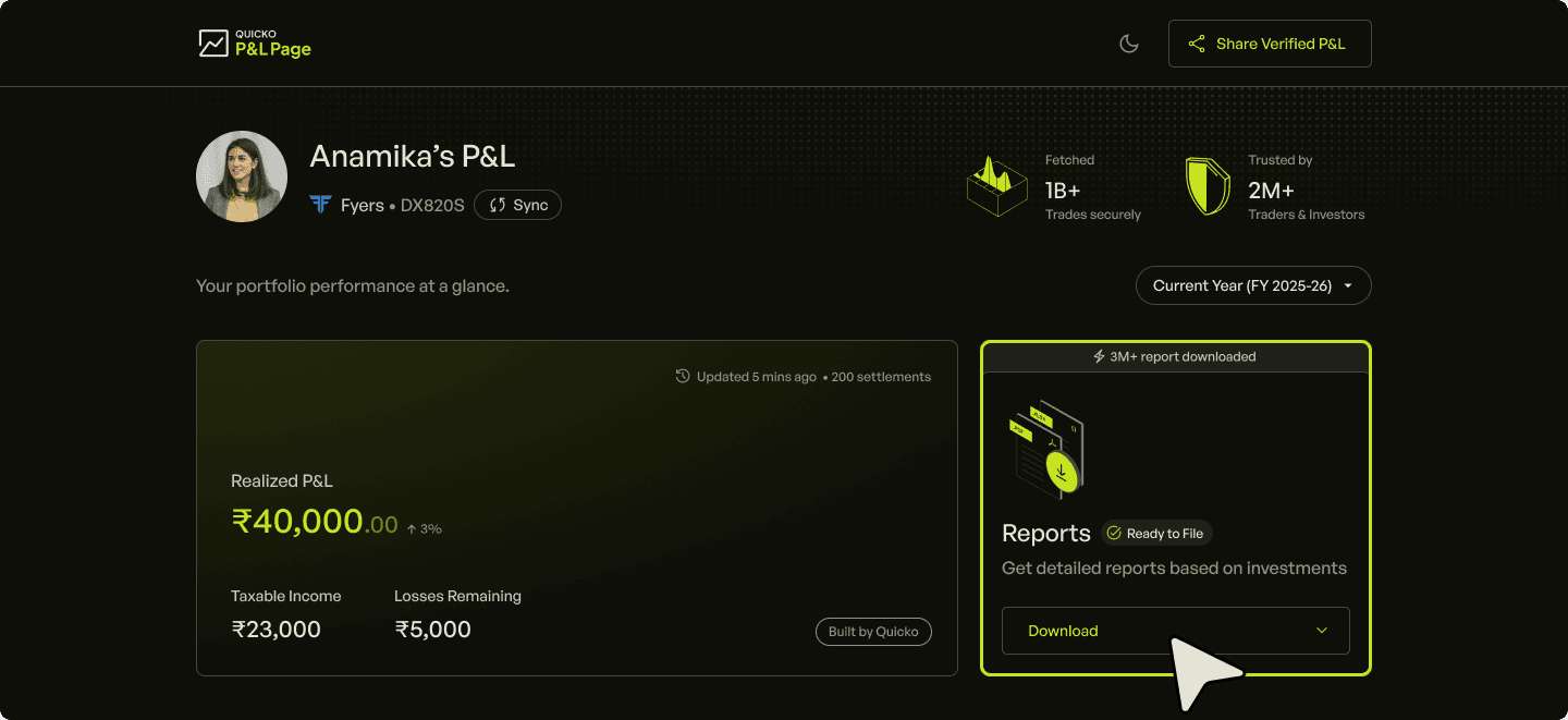 P&L Page is a free tool for investors & traders to connect their Fyers account, sync trades, visualise their P&L and download in-depth Tax P&L Report for the current and previous financial year.