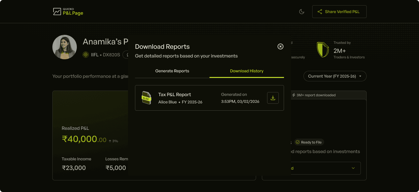 Tax P&L report is statement provided by broker that summarises realised gains, losses, and charges for a specific financial year. It is designed to simplify tax planning and filing by categorising trades into long term, short term capital gains and speculative/non-speculative income.